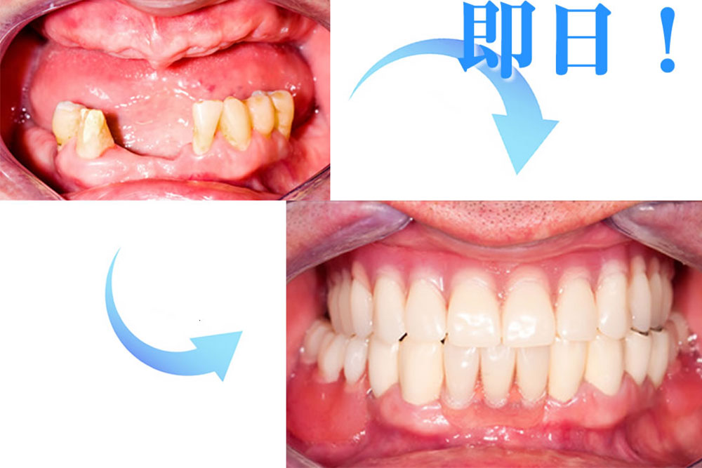 本来、インプラント治療は人工歯根を顎骨に埋めてから、骨と接合するまでの待機時間が3ヶ月~6ヶ月必要です。しかし、当院ではインプラントの埋入を行ったその日に仮歯まで装着する事が可能です。